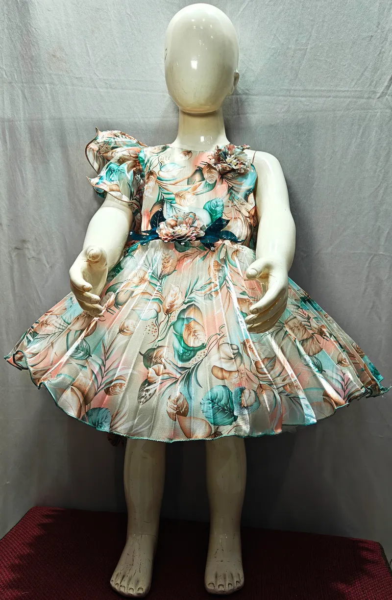 A charming frock with a pleated, full skirt and a bodice adorned with a pastel floral and leaf print in shades of peach, mint green, and brown. A small fabric flower is attached at the waist and on the one-shoulder design.