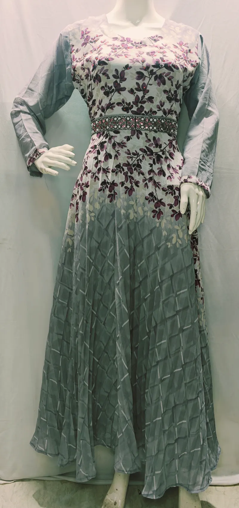 This umbrella kurti comes in a graceful sage green shade with a textured geometric pattern, highlighted by elegant purple floral prints across the bodice and skirt. The embellished waistband adds a touch of sparkle, while the umbrella flare enhances its flowy and stylish appeal, making it perfect for festive or semi-formal occasions.